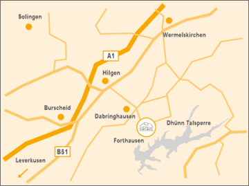 Autobahn A1 Leverkusen - Wuppertal, Abfahrt Burscheid. An der Ausfahrt links in Richtung Hilgen abbiegen, dann an der 2. Ampel rechts nach Dabringhausen einbiegen und ca. 6 km bergab/ bergauf fahren. Die Umgehungsstraße überqueren, dann der 2. Straße rechts in Richtung Freibad folgen. Am Freibad vorbei die kurvenreiche Strecke bis zur nächsten Straßenkreuzung in Grünenbäumchen fahren. Dort links bis zur Ketzbergerhöhe fahren und vor dem Wasserturm rechts nach Forthausen einbiegen. Unser Haus (Nr. 17) befindet sich nun nach ca. 400 m auf der rechten Seite.